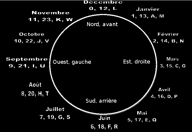 Désigner une direction ou une lettre, par les chiffres du cadran. Exemple : un sein cœur = à 150° à droite. Et inversement : elle était adroite = 1, 2, 3, 4, 5 (ou A, B, C, D, E et M, N, O, P, Q), ce qui permet de distinguer ces lettres de celles de gauche. On peut également convenir au préalable d’une association à un chiffre, pour désigner une personne, une langue...